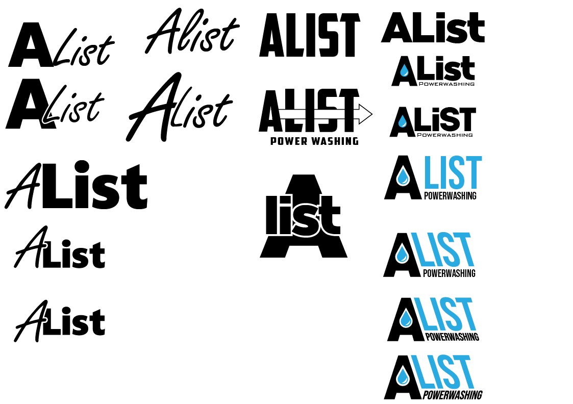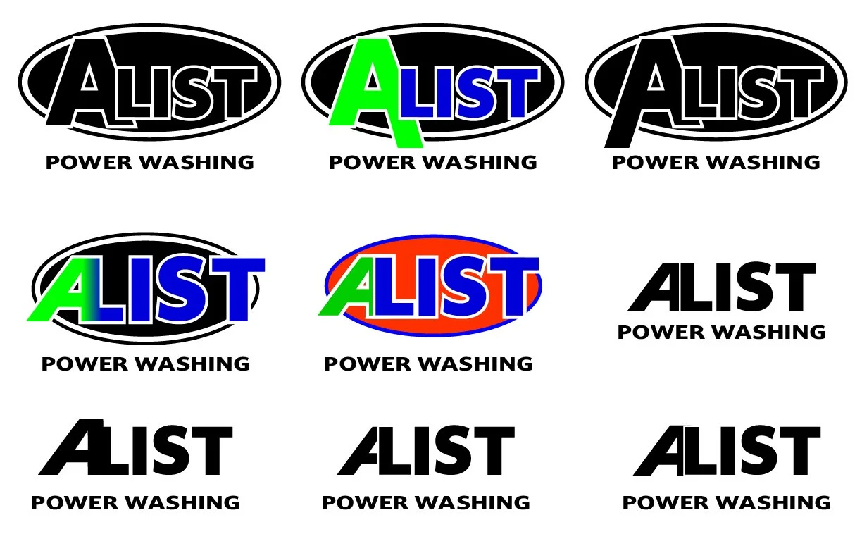A-List Power washing needed a new look, before reaching out to me the owner of this company just simply typed out his company name the same way in the same font and used that for his logo. He sought out some branding guidance and this is the process we took together to come up with his logo.